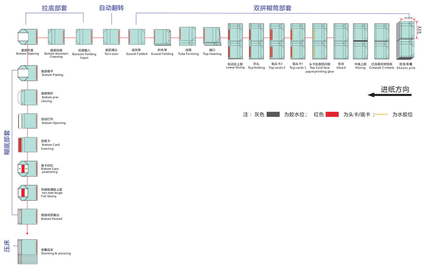 經過特殊的機械結構和電氣配合,一次性完成紙袋成型,紙張上膠、粘合、折袋口, 糊筒,折底,放底卡, 底部上膠封合等工藝;改變了以往大紙袋需手工加工制作;